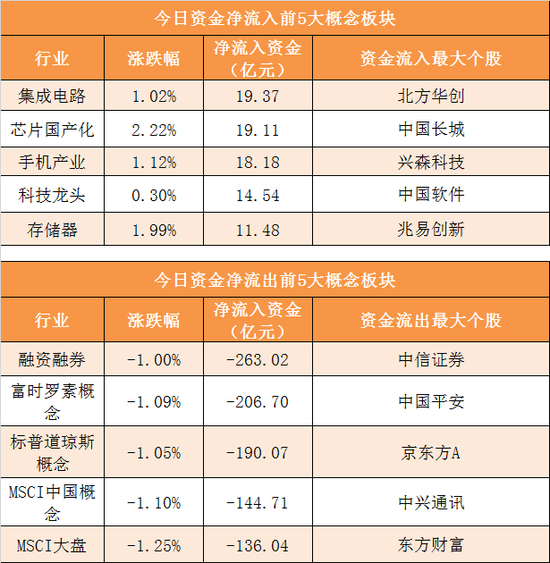 概念板块方面,今日集成电路、芯片国产化、手机产业、科技龙头等概念板块资金呈现净流入,其中集成电路概念净流入19.37亿元居首。