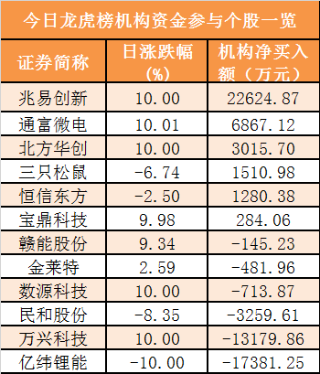 盘后龙虎榜数据显示,机构现身12股,其中兆易创新(180.290, 16.39,10.00%)等6股呈现机构资金净买入,亿纬锂能(31.400, -3.49, -10.00%)等6股呈现机构资金净卖出。