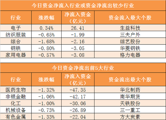28个申万一级行业中,仅电子1个行业实现资金净流入,医药生物、非银金融、化工、机械设备等行业净流出规模居前,其中医药生物行业净流出47.35亿元居首。