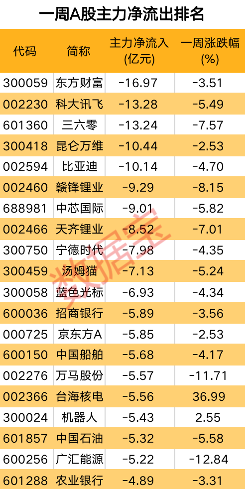 净流出方面,本周5股主力净流出在10亿元以上,东方财富居首,主力净流出16.97亿元。主力出逃新能源、大金融板块态势明显,比亚迪、赣锋锂业、天齐锂业、宁德时代等行业龙头均遭到主力7亿元以上资金撤离;招商银行、农业银行也登上主力撤离前20的榜单。