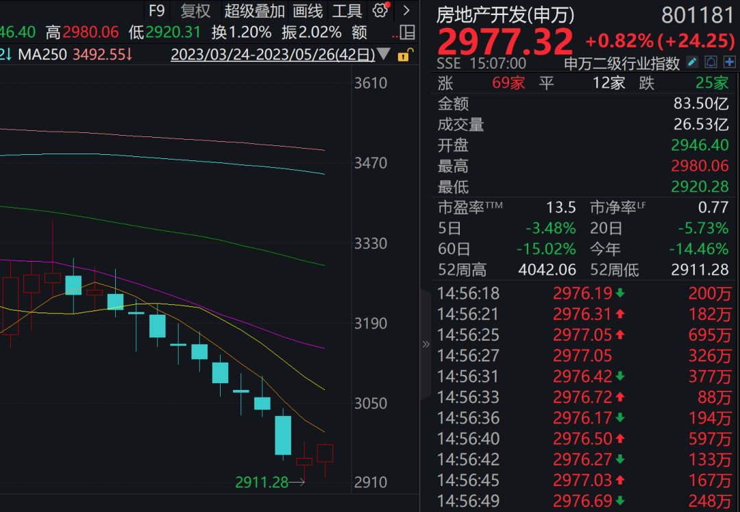 近期,房地产板块持续低迷。截至5月25日,申万房地产开发指数录得十连跌,累计跌幅9.09%,25日盘中一度下探至近9年低点。今日早盘,房地产开发指数持续下跌,跌幅超过1%;午后,指数止住跌势,板块快速反弹,全天收涨0.82%。