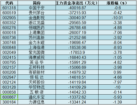 主力资金净流出个股中,中国平安主力资金净流出4.00亿元,净流出资金最多;其次是贵州茅台、金逸影视,净流出资金分别为3.72亿元、3.00亿元。