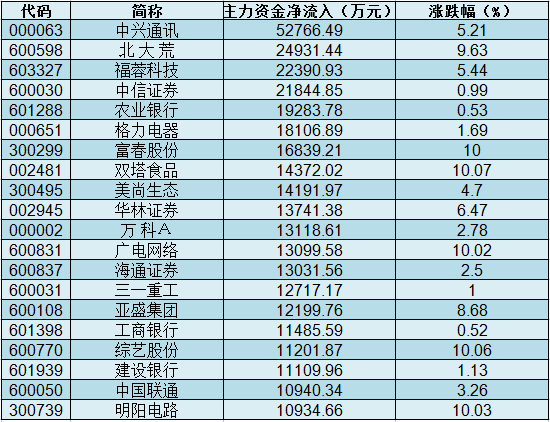 个股来看,共有21只个股主力资金净流入超亿元,中兴通讯主力资金净流入5.28亿元,净流入资金居首;北大荒、福蓉科技紧随其后,全天净流入资金分别为2.49亿元、2.24亿元;全天净流入资金较多的还有中信证券、农业银行等。股价表现方面,净流入资金超亿元个股今日平均上涨5.46%,表现强于大盘,涨停的有双塔食品、综艺股份、明阳电路等。
