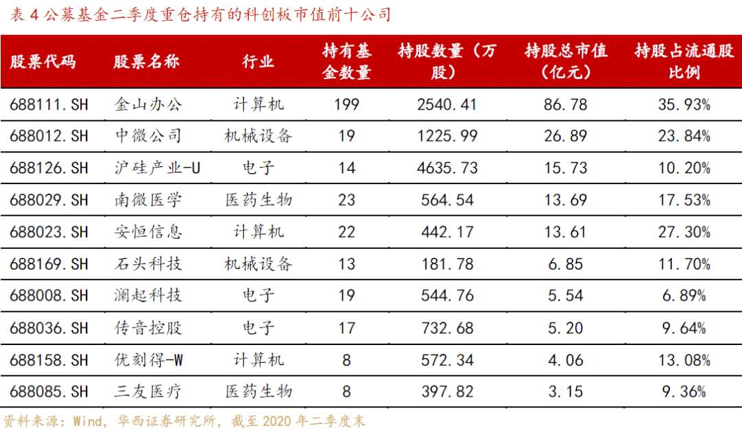 华西证券统计显示,二季报中共78只科创板公司出现在基金前十大重仓股中,其中重仓持有金山办公的基金有199只,持股总市值86.78亿元,占流通股比例35.93%。中微公司和沪硅产业的基金持股市值排在其后,分别为26.89亿元和15.73亿元。