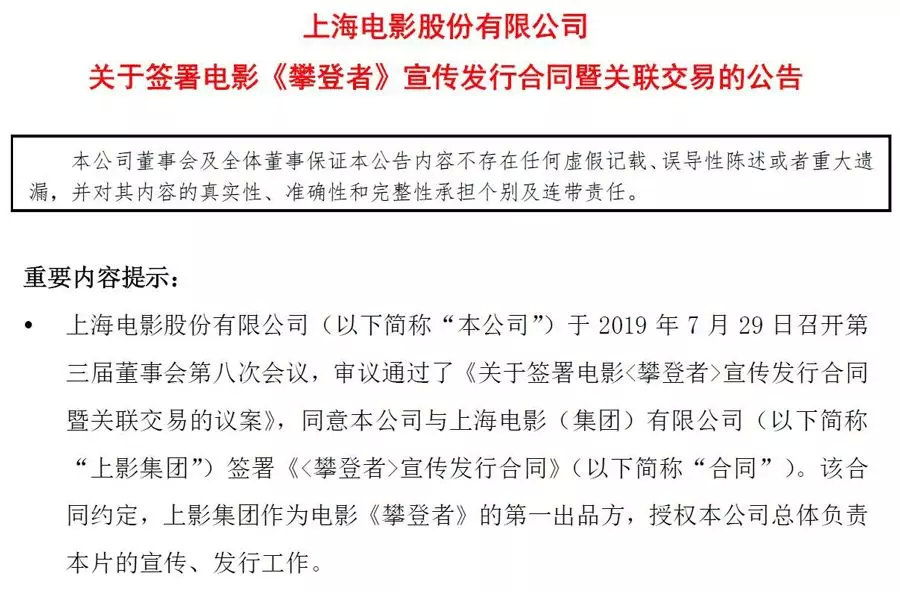 今年7月底,上海电影发布公告称,合同约定上影集团作为电影《攀登者》的第一出品方,授权上市公司总体负责该片宣传、发行工作。其中,发行合同授权权利包括院线发行权、宣传。