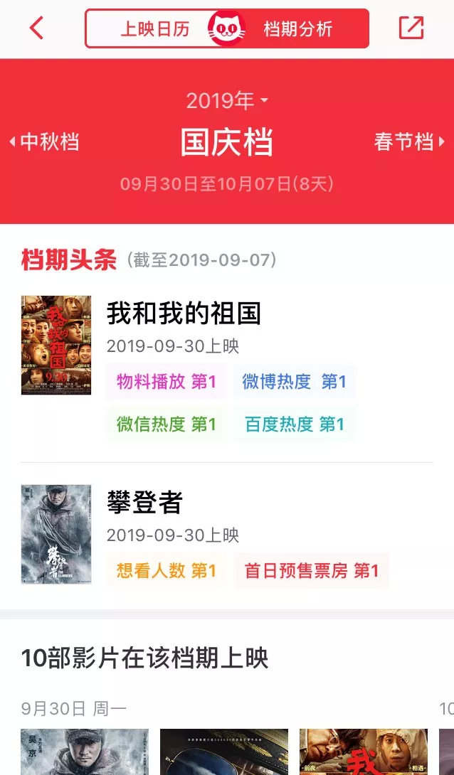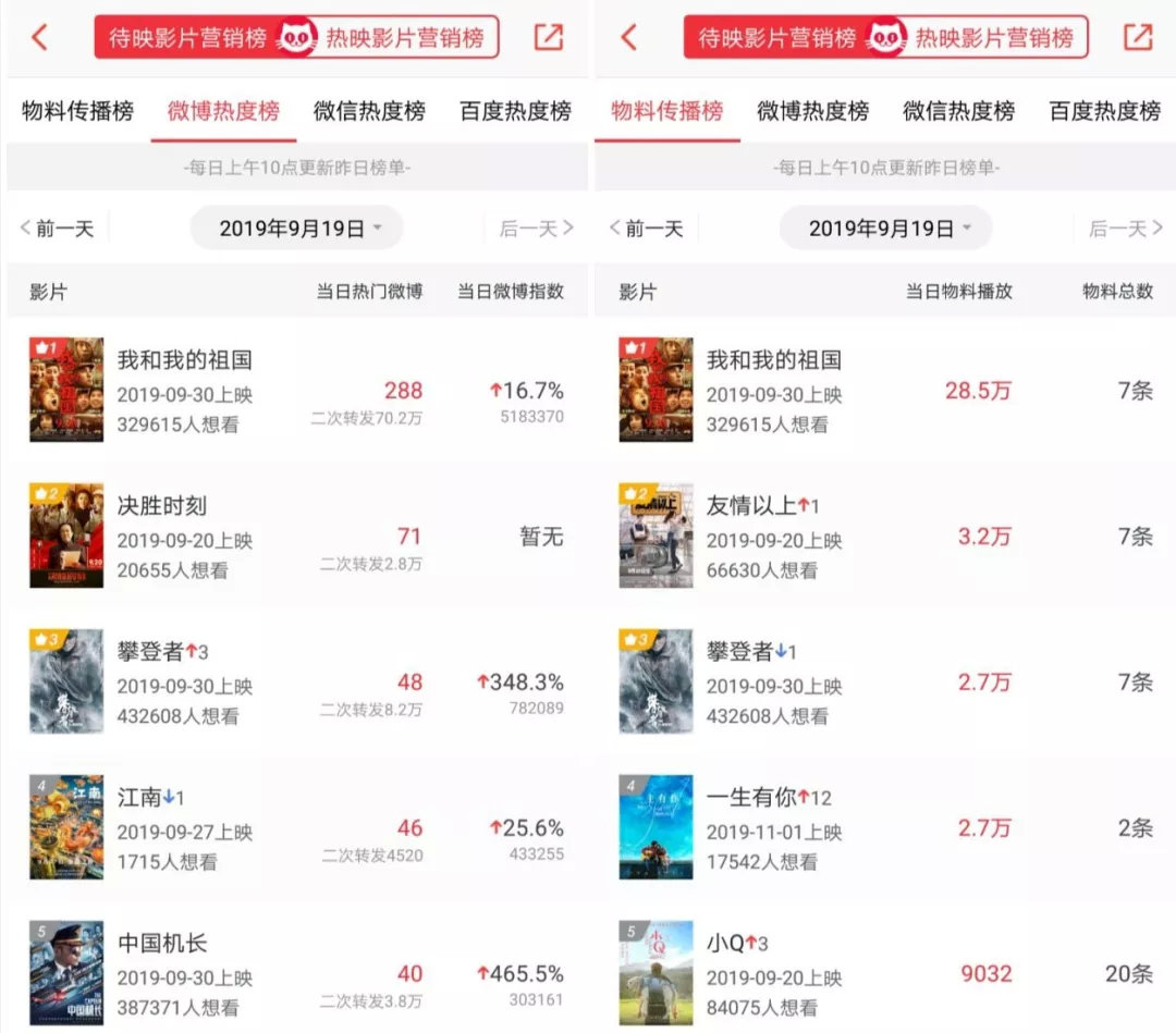 根据数据,目前无论是在物料播放还是微博、微信等平台上的热度,《攀登者》目前都未能超过《我和我的祖国》,且后者被提档至9月30日上映。上海电影能否一举成为“爆款收割机”,还需经历国庆档的考验。