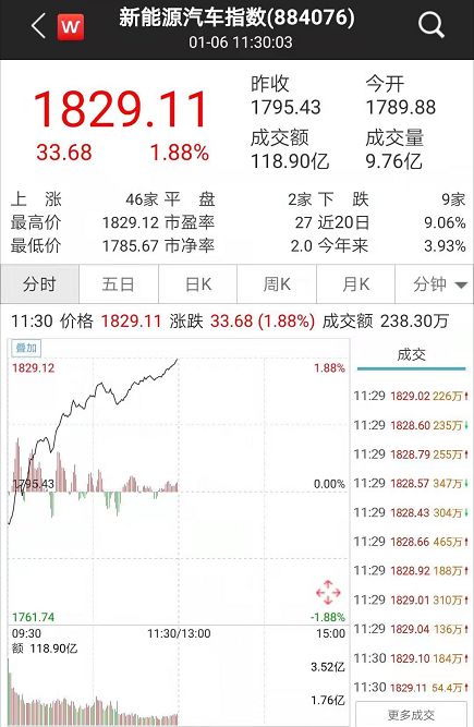 除了特斯拉概念股之外,A股新能源汽车板块也出现了放量大涨的行情。1月6日上午,新能源汽车板块170多只个股飘红,其中多只新能源汽车概念股涨停。截至午盘收盘,新能源汽车指数报收1829.11,指数涨幅超1.88%,市值飙升330亿元。