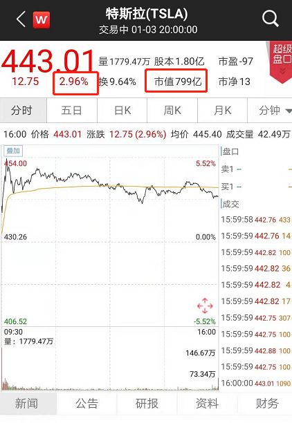 而在美股市场,特斯拉股价更是走出大涨态势。1月3日,特斯拉美股开盘后高开高走,股价一度涨幅超过5.52%,盘中市值大破800亿美元。截至当日收盘,特斯拉股价报收443美元,市值高达799亿美元。