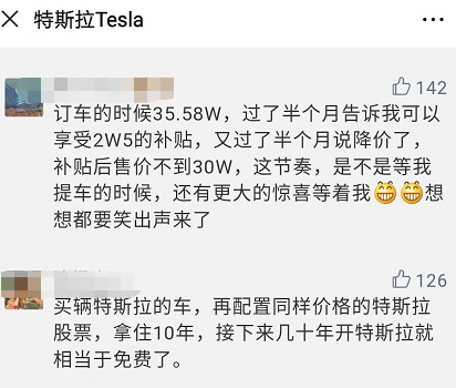 在特斯拉官方微信留言下,部分订购了第一批国产特斯拉新车的准车主感叹:“简直是天上掉馅饼了”。