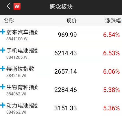 1月6日开盘,特斯拉概念板块高开高走,指数迅速上涨5%以上。短短半日,特斯拉板块有超180亿资金疯狂涌入,板块市值飙涨近300亿元,成为当日领涨两市的最亮眼概念。同时,造车新势力蔚来汽车概念股也同时上涨,国内新能源汽车板块掀起一股涨停潮。