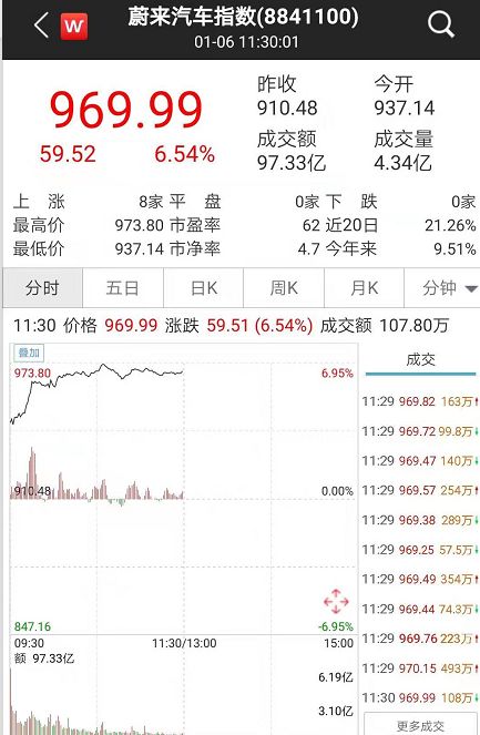 同时,国产造车新势力蔚来汽车产业链也出现明显异动。1月6日上午,蔚来汽车板块大涨超6.54%,半日板块成交资金高达97亿元。