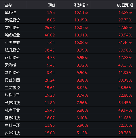 而板块内,奥特佳、天通股份、文灿股份、中国宝安、赣锋锂业等概念个股涨停,超17只个股涨幅超5%以上。