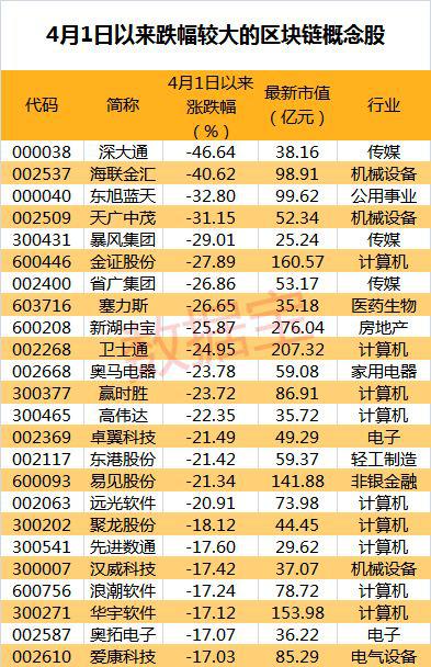 但是,上涨没有持续性,数据宝统计发现,在50多只区块链概念股中,仅有9只最新收盘价高于4月1日当天收盘价,而有40多只个股价格已低于4月1日当天价格,跌幅超过20%的有17家。