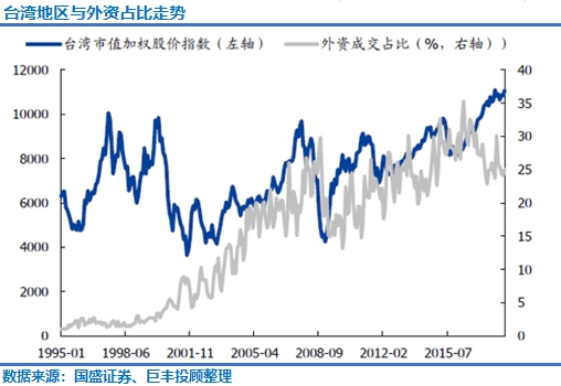 我国台湾地区也是如此,其国际化进程起始于90年代,目前外资持股占比基本维持在25%左右。其纳入MSCI后,整体市场走势也是一样,随着外资占比逐步提升,指数也不断走高。