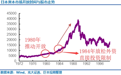 不过这种双向对称开放也有劣势,就是在日本“爆炸”式的金融开放后,国际资本加速涌入日本,明显推升了日本房地产和股市的快速上行,最终导致了日本地产、股市泡沫破灭。(这点值得我国注意)