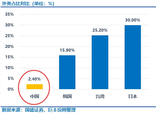 以日本(30%)、台湾(25.2%)、韩国(15.9%)三个市场的外资占比为参考,而当前A股总市值大约53万亿元左右,境外机构和个人持股市值1.27万亿元左右。
