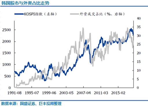 可看出随着外资占比逐步增加,资本市场也走出了明显的上升趋势。在亚洲金融危机爆发后,MSCI完成了韩国100%扩容,外资占比随后加速上升,韩国股市也同步上行。