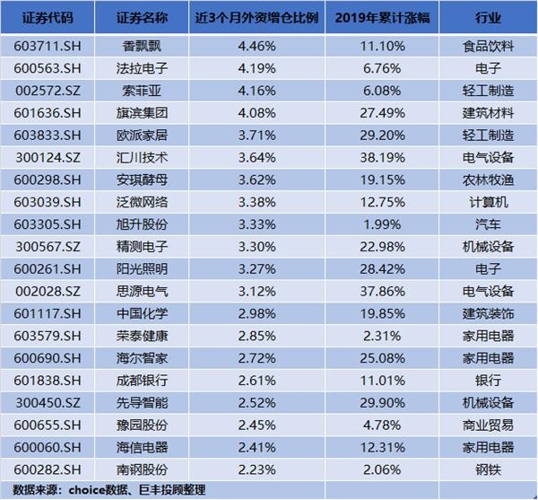 通过以上的案例和近期事件表明,虽然A股当前相对低迷,但是对外资的吸引力似乎没有降低。相关机会不妨可关注一下近期外资加仓或者重仓个股,尤其是一些近期加仓明显但是涨幅不高个股。下图是近3个月来,外资增仓力度较大、但整体涨幅不高的个股一览,仅供参考:(剔除2019年涨幅超过30%以上个股)