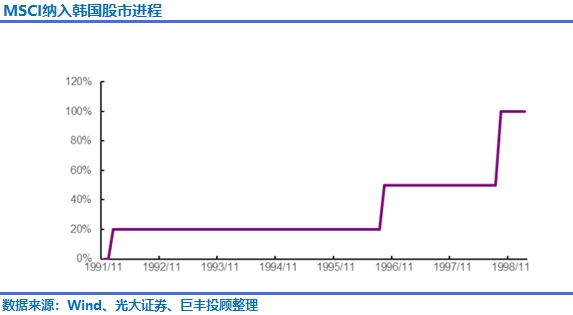 第三阶段,1998 年 9 月 1 日,韩国股市以100%的比例完全纳入MSCI指数。