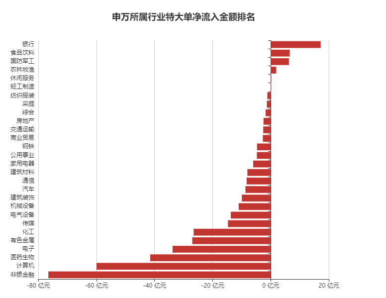 从28个申万一级行业来看,今日有6个行业特大单资金净流入,银行特大单净流入规模居首,净流入资金17.20亿元,该行业指数今日上涨0.29%,其次是食品饮料,今日上涨0.58%,净流入资金为6.55亿元,净流入资金居前的还有国防军工、农林牧渔等行业。