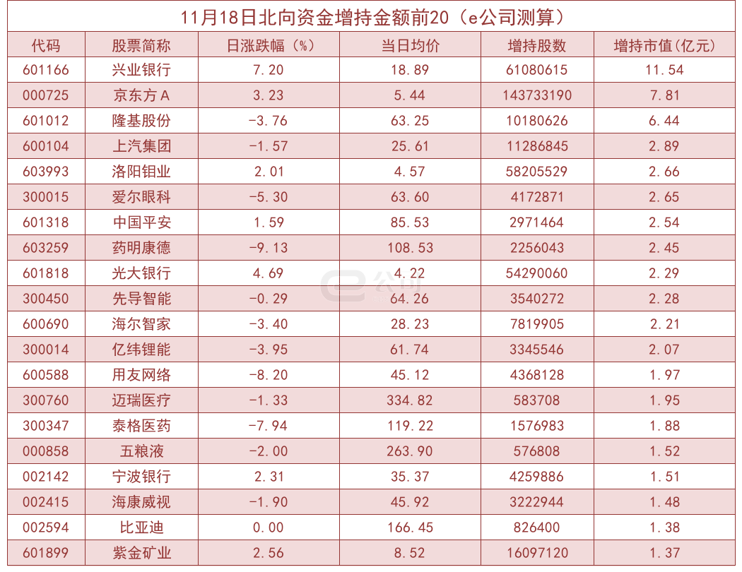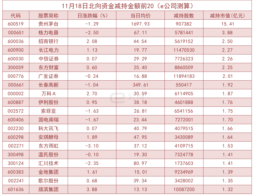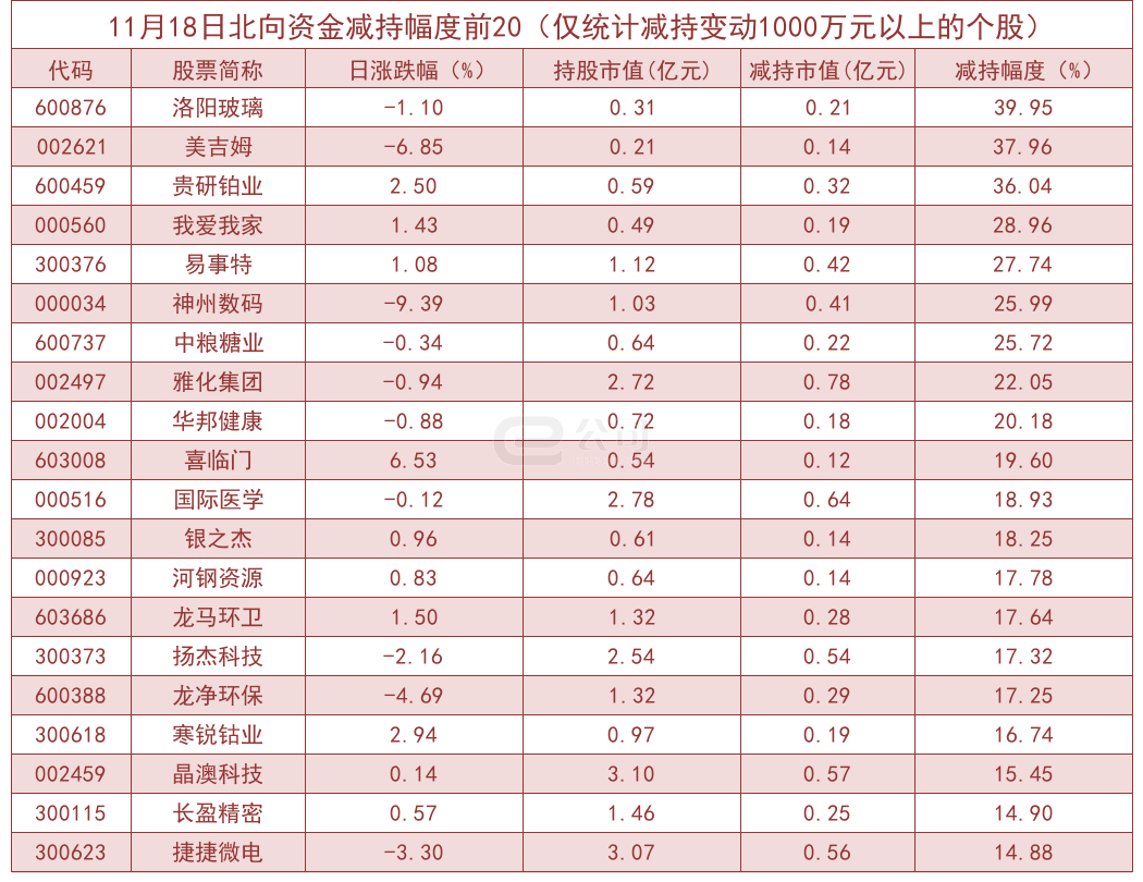 据e公司测算,增减持变动1000万元以上的个股中,迎驾贡酒、爱施德、普利特、常山北明等获北向资金大幅增持,分别为102.67%、83.88%、49.23%、47.75%。而洛阳玻璃、美吉姆、贵研铂业、我爱我家等减持幅度较大,分别减持39.95%、37.96%、36.04%、28.96%。