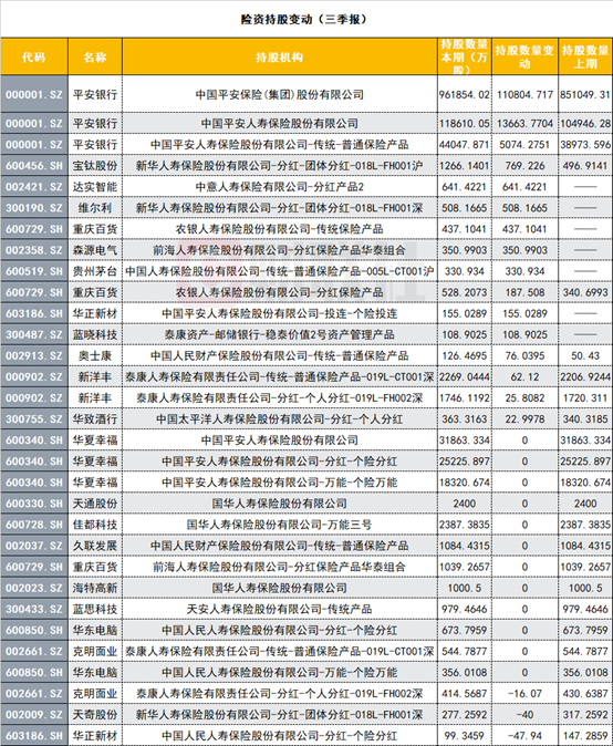 险资方面,三季度新增持仓排名分别为达实智能(641.42万股)、维尔利(508.17万股)、重庆百货(437.10万股)、森源电气(350.99万股)、贵州茅台(330.93万股)。