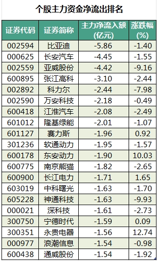 此外,3484只个股被主力资金净卖出,其中,43股被主力资金净卖出超1亿元。主力资金净流出最多的个股是比亚迪,净流出金额为5.86亿元;主力资金净流出居前的个股还有长安汽车、亚威股份、张江高科、科力尔、万安科技,净流出金额分别为4.45亿元、4.42亿元、3.1亿元、2.44亿元、2.18亿元。