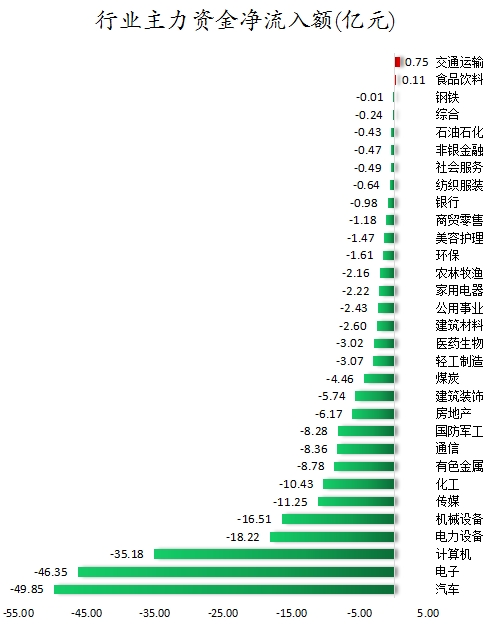 从行业板块来看,申万所属的31个一级行业,今日仅有交通运输、食品饮料2个行业板块主力资金呈现净流入,净流入金额分别为0.75亿元、0.11亿元。29个行业板块主力资金呈现净流出,其中,汽车行业板块主力资金净流出最多,净流出金额为49.85亿元;行业板块主力资金净流出靠前的还有电子、计算机、电力设备、机械设备、传媒、化工,净流出金额分别为46.35亿元、35.18亿元、18.22亿元、16.51亿元、11.25亿元、10.43亿元。