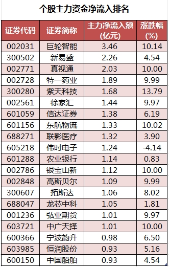 个股来看,今日有1588只个股获主力资金净流入,其中,17股获主力资金净流入超1亿元。巨轮智能获主力资金净流入最多,净流入金额为3.46亿元;主力资金净流入居前的个股还有新易盛、真视通、特一药业、紫天科技、徐家汇,流入金额分别为2.26亿元、2.03亿元、1.89亿元、1.68亿元、1.44亿元。