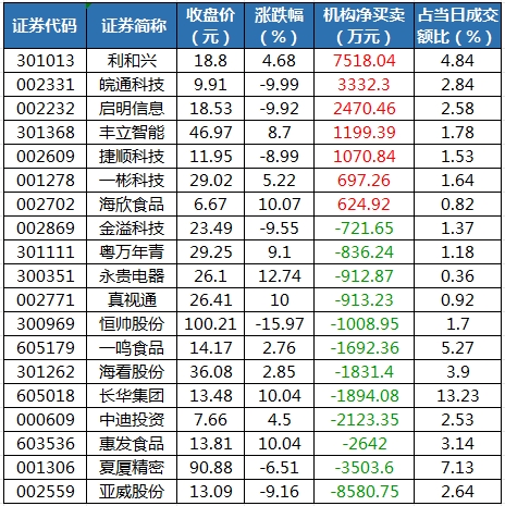 盘后龙虎榜数据显示,今日机构席位资金合计净卖出约9747.27万元。其中,净买入的个股7只,净卖出的个股12只。机构净买入最多的股票是利和兴,净买入金额约7518.04万元;机构净买入居前的还有皖通科技、启明信息等股。机构净卖出最多的股票是亚威股份,净卖出金额约8580.75万元;机构净卖出居前的还有夏厦精密、惠发食品、中迪投资等股。