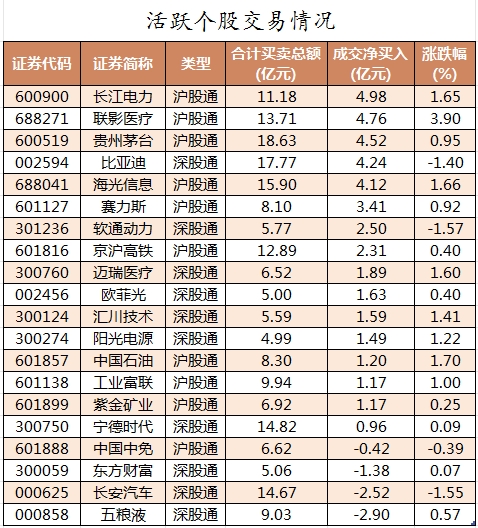 活跃个股方面,北向资金今日净买入较多的有长江电力、联影医疗、贵州茅台、比亚迪、海光信息,净买入金额分别为4.98亿元、4.76亿元、4.52亿元、4.24亿元、4.12亿元。北向资金净卖出的有五粮液、长安汽车、东方财富、中国中免,净卖出金额分别为2.9亿元、2.52亿元、1.38亿元、0.42亿元。