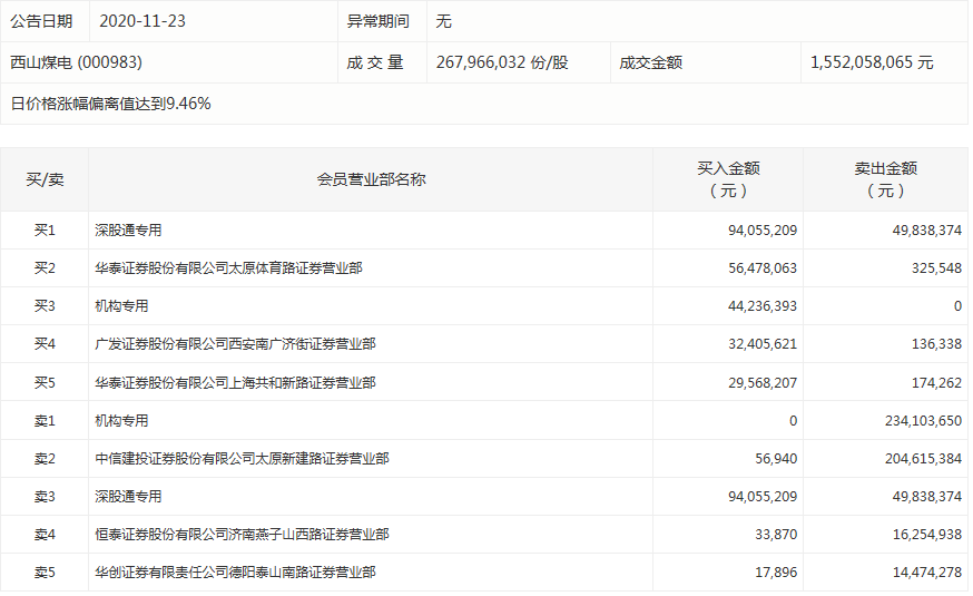 西山煤电今天涨停。盘后数据显示,2个机构出现在龙虎榜单上,分别位列买3及卖1席位,合计净卖出1.9亿元;华泰证券股份有限公司太原体育路证券营业部买入5647.81万元,同时卖出32.55万元;中信建投证券股份有限公司太原新建路证券营业部买入5.69万元,同时卖出2.05亿元。