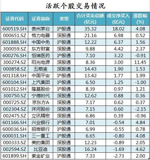 活跃个股方面,贵州茅台、格力电器、中国中免、东方财富、恒瑞医药北向资金净买入较多,净买入金额分别为18.02亿元、6.98亿元、6.37亿元、4.42亿元、3.22亿元。紫金矿业、比亚迪、美的集团、三一重工、招商银行北向资金净卖出较多,净卖出金额分别为2.73亿元、1.69亿元、0.89亿元、0.8亿元、0.55亿元。
