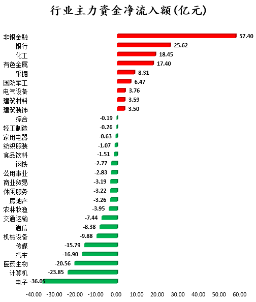 从行业板块来看,申万所属的28个一级行业,有9个行业板块主力资金呈现净流入。其中,非银金融、银行、化工、有色金属、采掘行业板块主力资金净流入居前,净流入金额分别为57.4亿元、25.62亿元、18.45亿元、17.4亿元、8.31亿元;19个行业板块主力资金呈现净流出,其中,电子、计算机、医药生物、汽车、传媒行业板块主力资金净流出较多,净流出金额分别为36.05亿元、23.85亿元、20.56亿元、16.9亿元、15.79亿元。