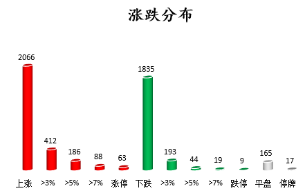 截至收盘,沪深两市合计2066只个股上涨,1835只个股下跌,平盘个股165只,停牌的个股17只。包括ST股在内,共有63只个股涨停,9只个股跌停。