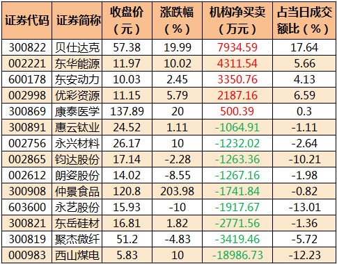 盘后龙虎榜数据显示,机构席位资金净卖出约1.54亿元,其中,净买入的个股5只,净卖出的个股9只。机构净买入最多的股票是贝仕达克,净买入金额约为7934.59万元;机构净卖出最多的股票是西山煤电,净卖出金额约为1.9亿元。