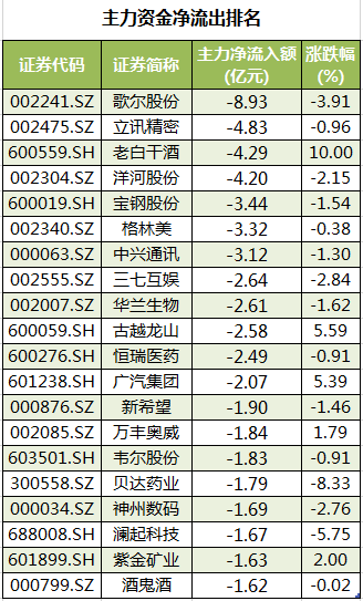 此外,48股被主力资金净卖出超亿元。其中,歌尔股份、立讯精密、老白干酒、洋河股份、宝钢股份主力资金净流出较多,净流出金额分别为8.93亿元、4.83亿元、4.29亿元、4.2亿元、3.44亿元。