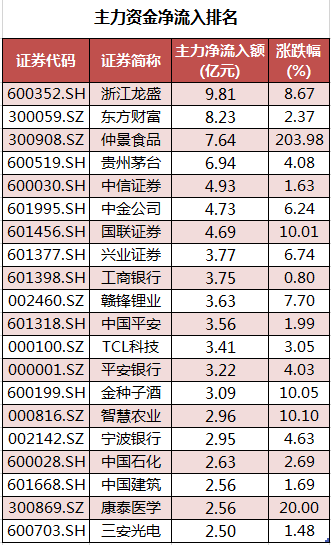具体到个股来看,80股主力资金净流入超亿元。其中,浙江龙盛、东方财富、仲景食品、贵州茅台、中信证券主力资金净流入居前,净流入金额分别为9.81亿元、8.23亿元、7.64亿元、6.94亿元、4.93亿元。