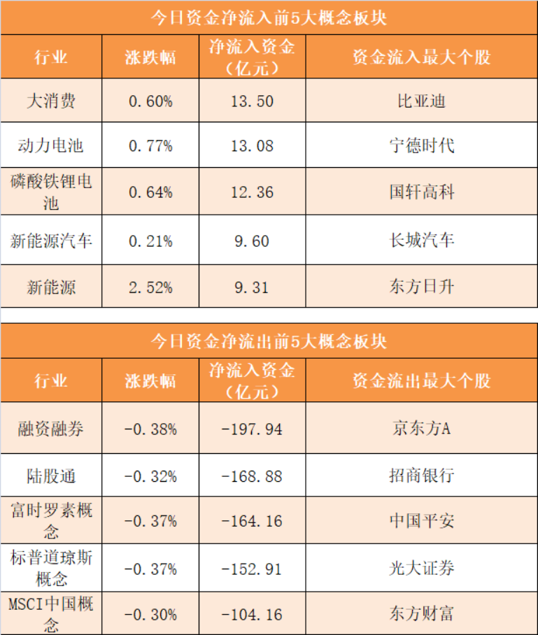 概念板块方面,今日大消费、动力电池等概念板块资金呈现净流入,其中大消费概念净流入13.5亿元居首。