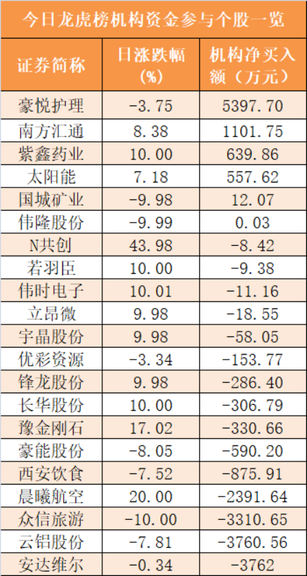 盘后龙虎榜数据显示,机构现身21股,其中豪悦护理等6股呈现机构资金净买入,安达维尔等15股呈现机构资金净卖出。