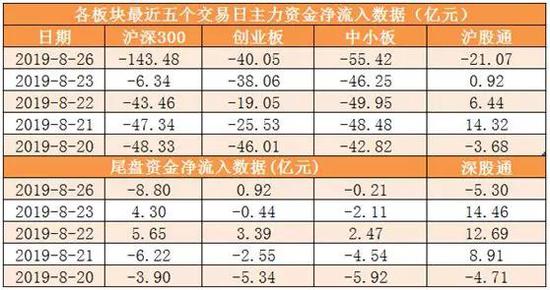 沪深300今日主力资金净流出143.48亿元,创业板净流出40.05亿元,中小板净流出55.42亿元。沪股通净流出21.07亿元,深股通净流出5.3亿元(本文中沪股通、深股通净流入额以当日已用额度来计,与成交净买入额略有差异,但表示的意义大体一致)。