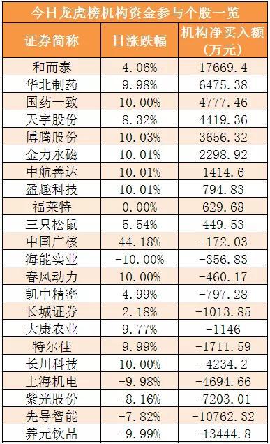 盘后龙虎榜数据显示,机构现身22股,其中和而泰(14.090, 0.55,4.06%)等10股呈现机构资金净买入,养元饮品(30.170, -3.35, -9.99%)等12股呈现机构资金净卖出。