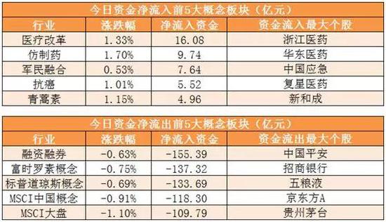 概念板块方面,今日医疗改革、仿制药、军民融合等概念板块资金呈现净流入,其中医疗改革概念净流入16.08亿元居首。