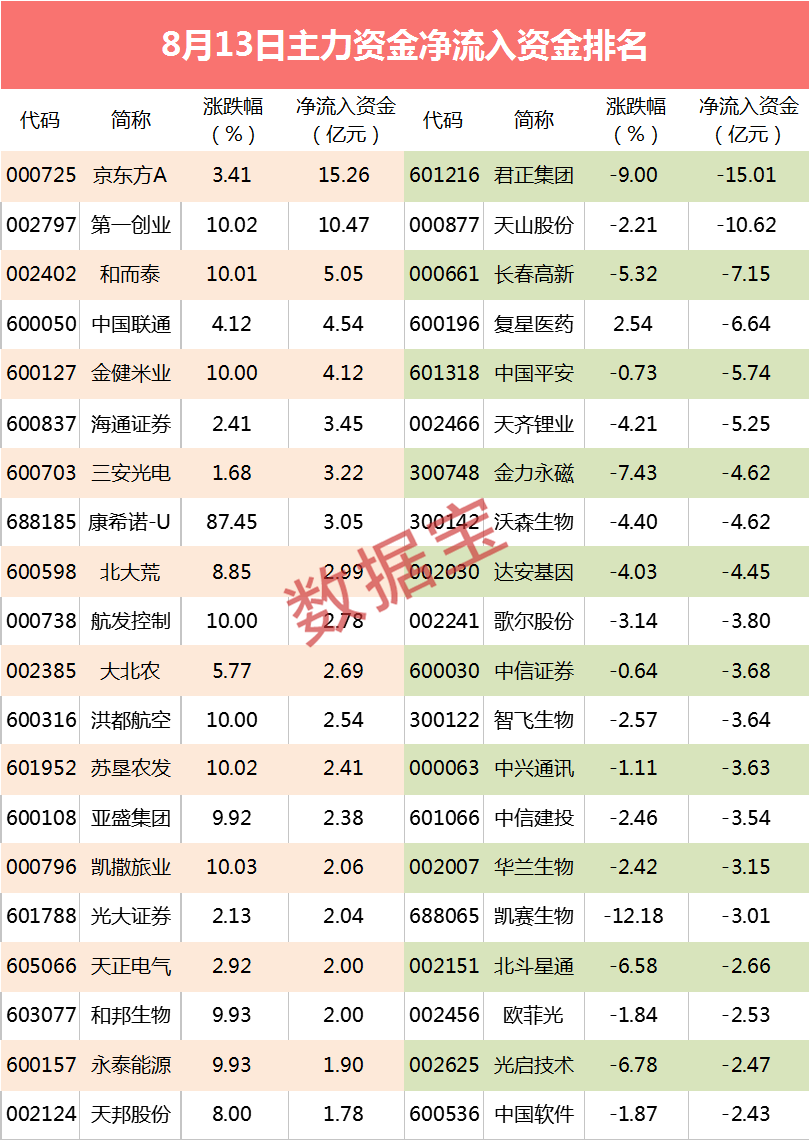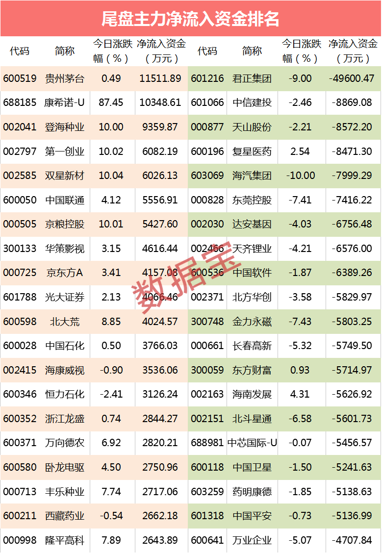 君正集团尾盘资金流出达4.96亿元,疫苗第一股今日上市后,此前被爆炒的疫苗概念股明显降温,君正集团尾盘出现几波跳水,最终收跌9%。中信建投、天山股份、复星医药三只个股流出资金超8000万元。