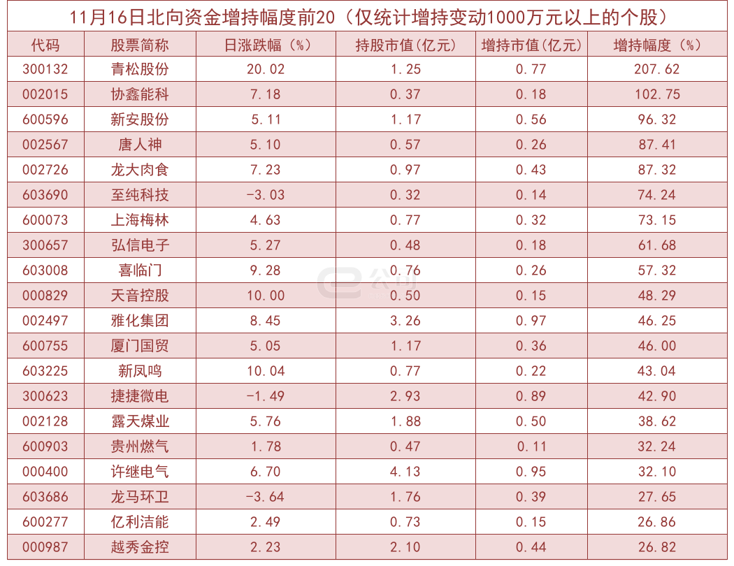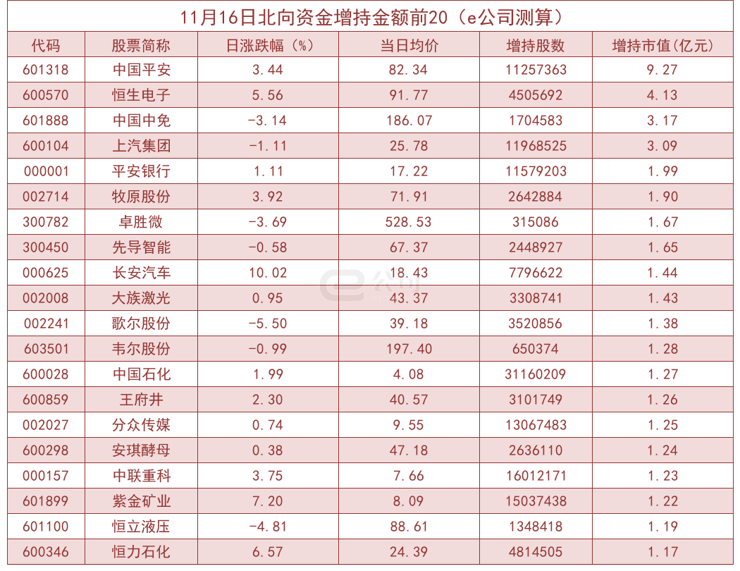 统计数据显示,11月16日北向资金合计净流入25.89亿元。其中沪股通净流入37.66亿元,深股通净流出11.77亿元。北向资金成交金额达到924.84亿元,占A股当日总成交金额比重为11.55%。