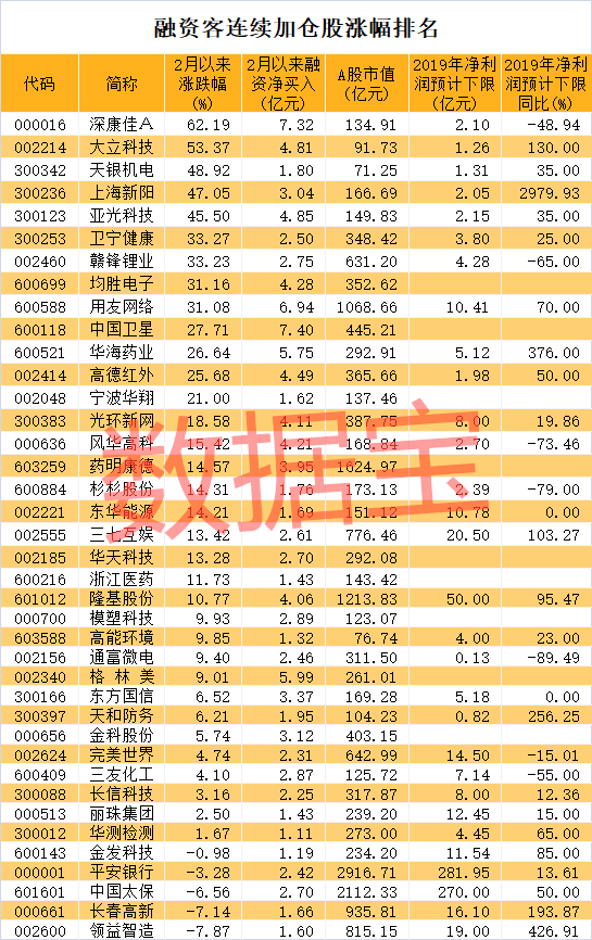在这39只股票中,不乏市值超千亿的行业龙头公司,如中国平安、中国太保、药明康德、隆基股份、用友网络等。从二级市场表现来看,这些股票整体表现超过同期大盘指数,2月以来共13股累计涨幅超过20%。深康佳A累计涨幅62.19%表现最佳;其次是大立科技、天银机电、上海新阳、亚光科技、卫宁健康等。从业绩数据来看,21股去年净利润有望同比增长超过10%,其中上海新阳、领益智造、华海药业、天和防务、长春高新、大立科技、三七互娱等净利润有望翻倍增长。