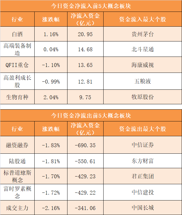 概念板块方面,今日白酒、高端装备制造、QFII重仓、高盈利成长股等概念板块资金呈现净流入,其中白酒概念净流入20.95亿元居首。