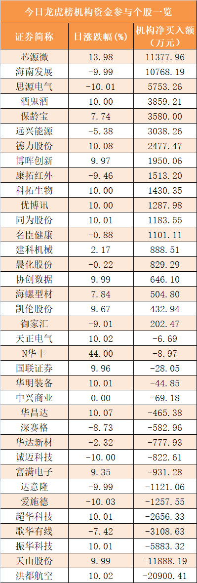 盘后龙虎榜数据显示,机构现身36股,其中芯源微等19股呈现机构资金净买入,洪都航空等17股呈现机构资金净卖出。