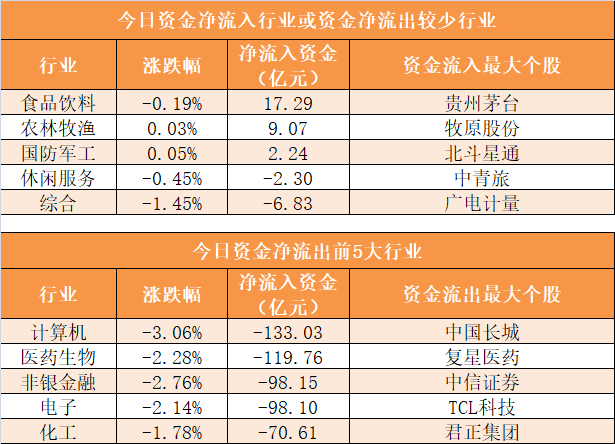 28个申万一级行业中,3个行业实现资金净流入,其中食品饮料行业净流入17.29亿元居首。