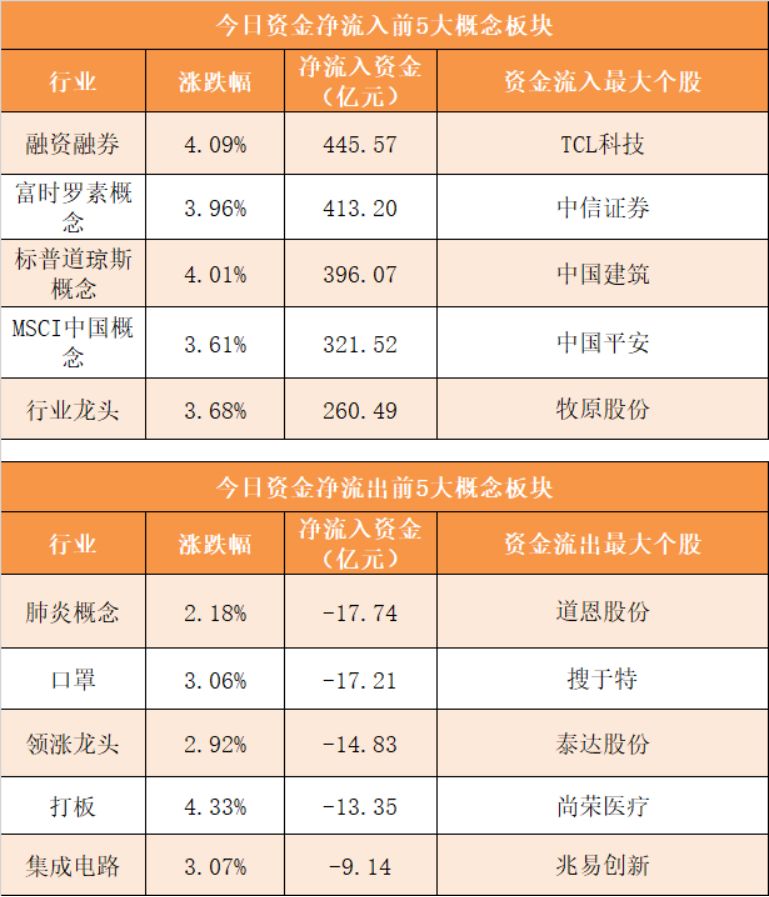 概念板块方面,今日融资融券、富时罗素概念、标普道琼斯概念、MSCI中国等概念板块资金呈现净流入,其中融资融券概念净流入445.57亿元居首。